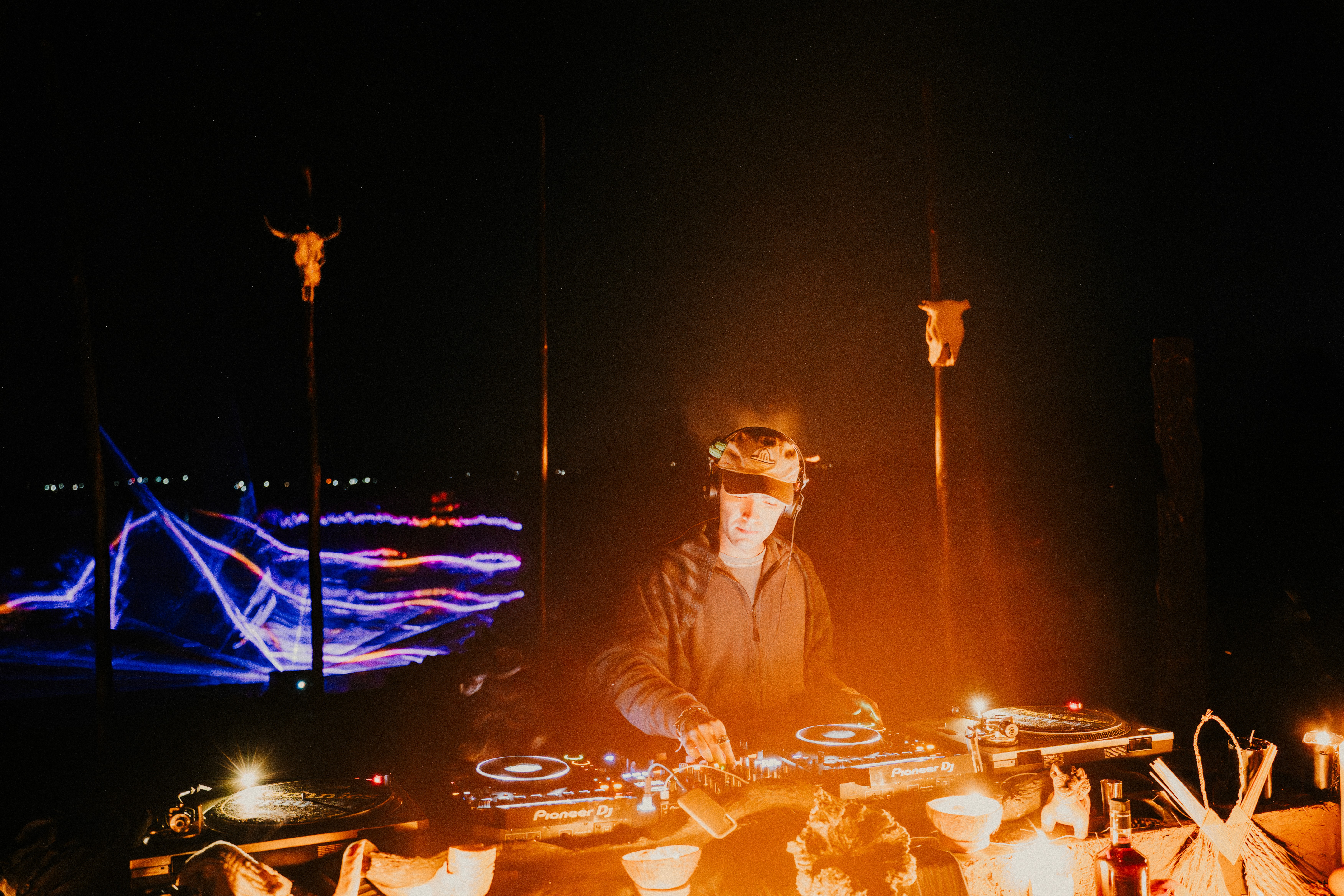 Beyond audiovisual documentation, rastro was responsible for the overall production design of the event. The spatial concept was developed as an immersive ceremonial environment: from the layout of the gathering to the design of the DJ booth, conceived as a Día de Muertos altar, integrating symbolic elements into the musical nucleus of the experience. The project also included the design of the camping area, where individual tents were conceived as part of the visual and spatial narrative rather than purely functional structures. Additionally, a dedicated chilling lounge area was designed as a contrasting atmosphere within the event — a contemplative zone that balanced the intensity of the ritual and musical components.