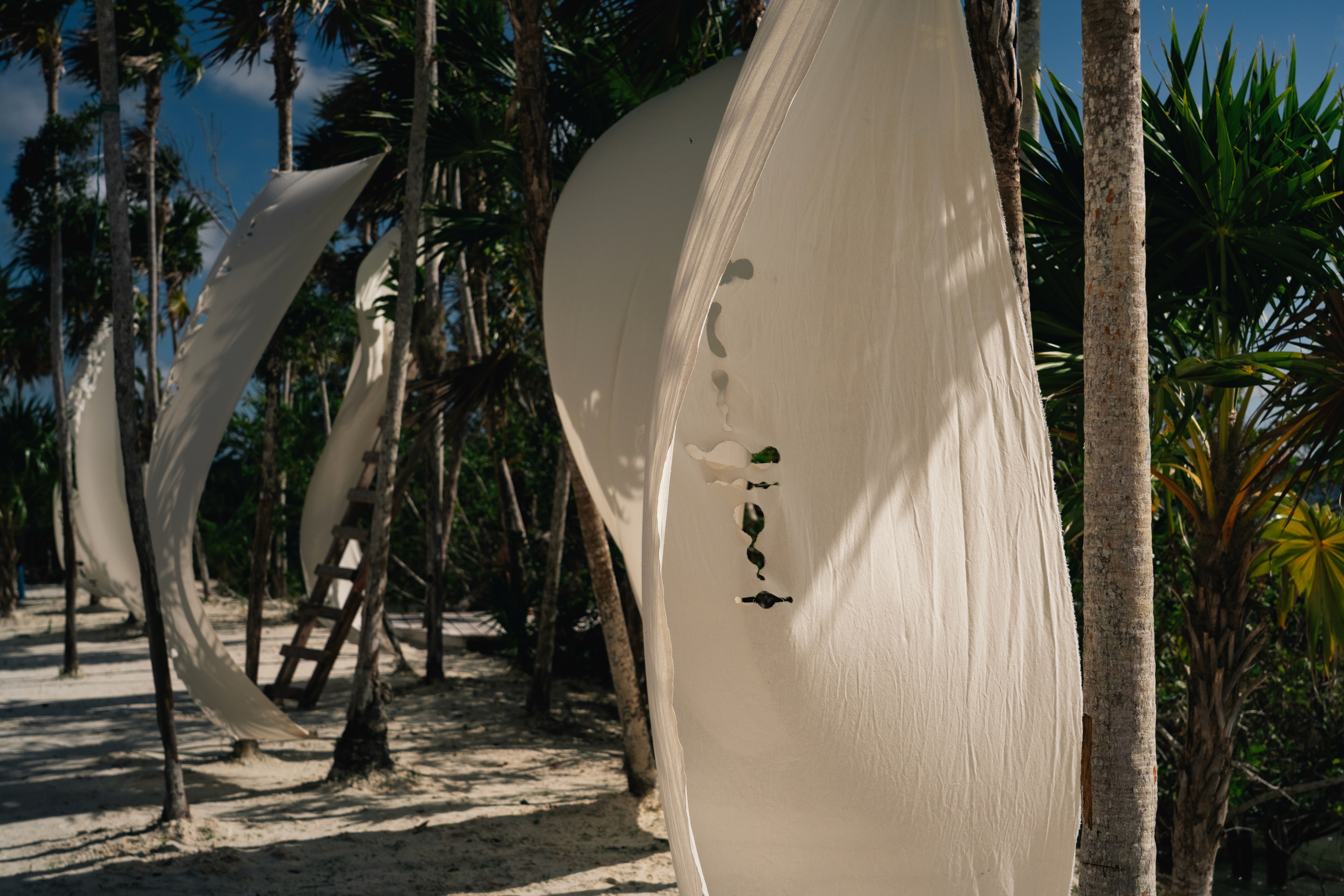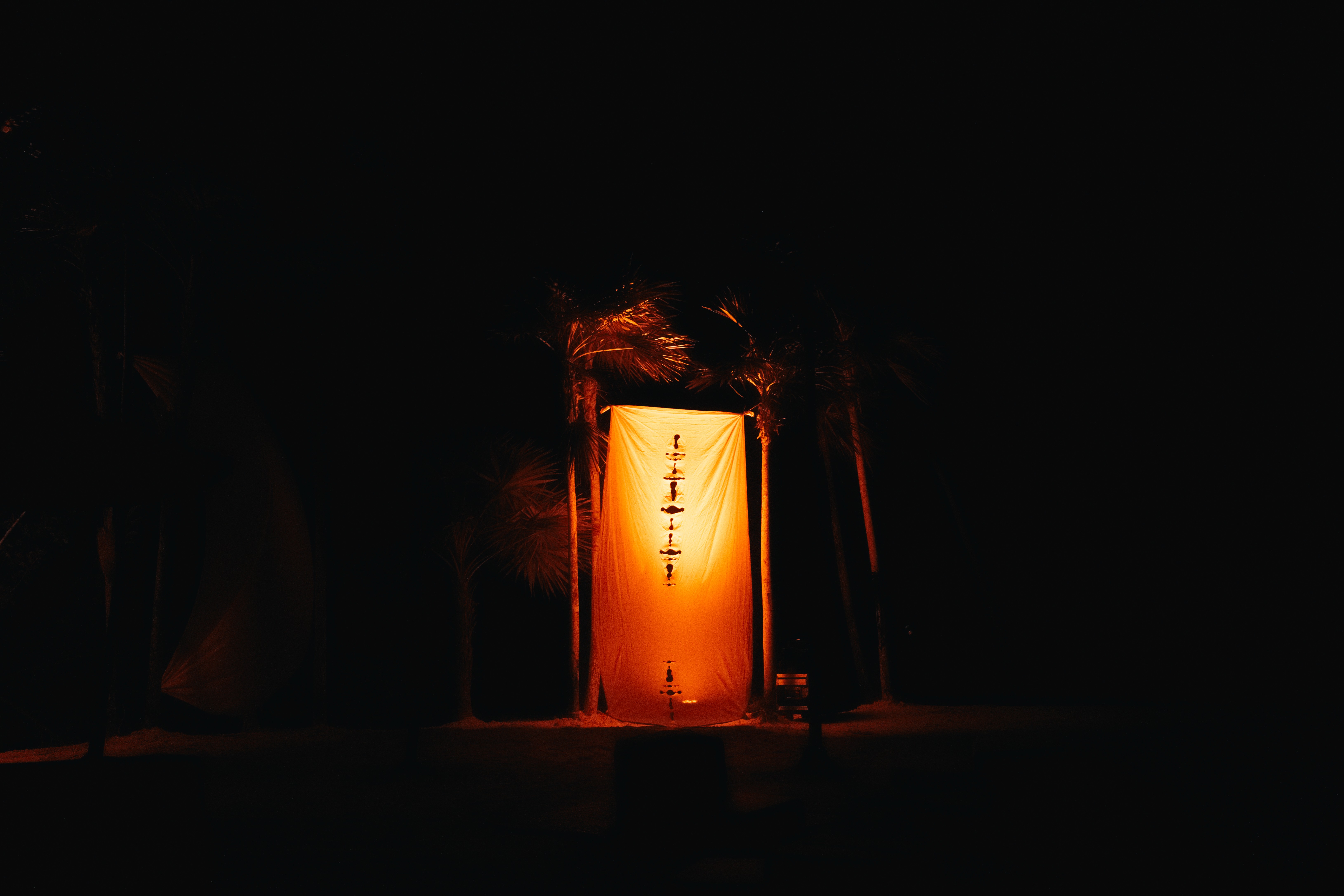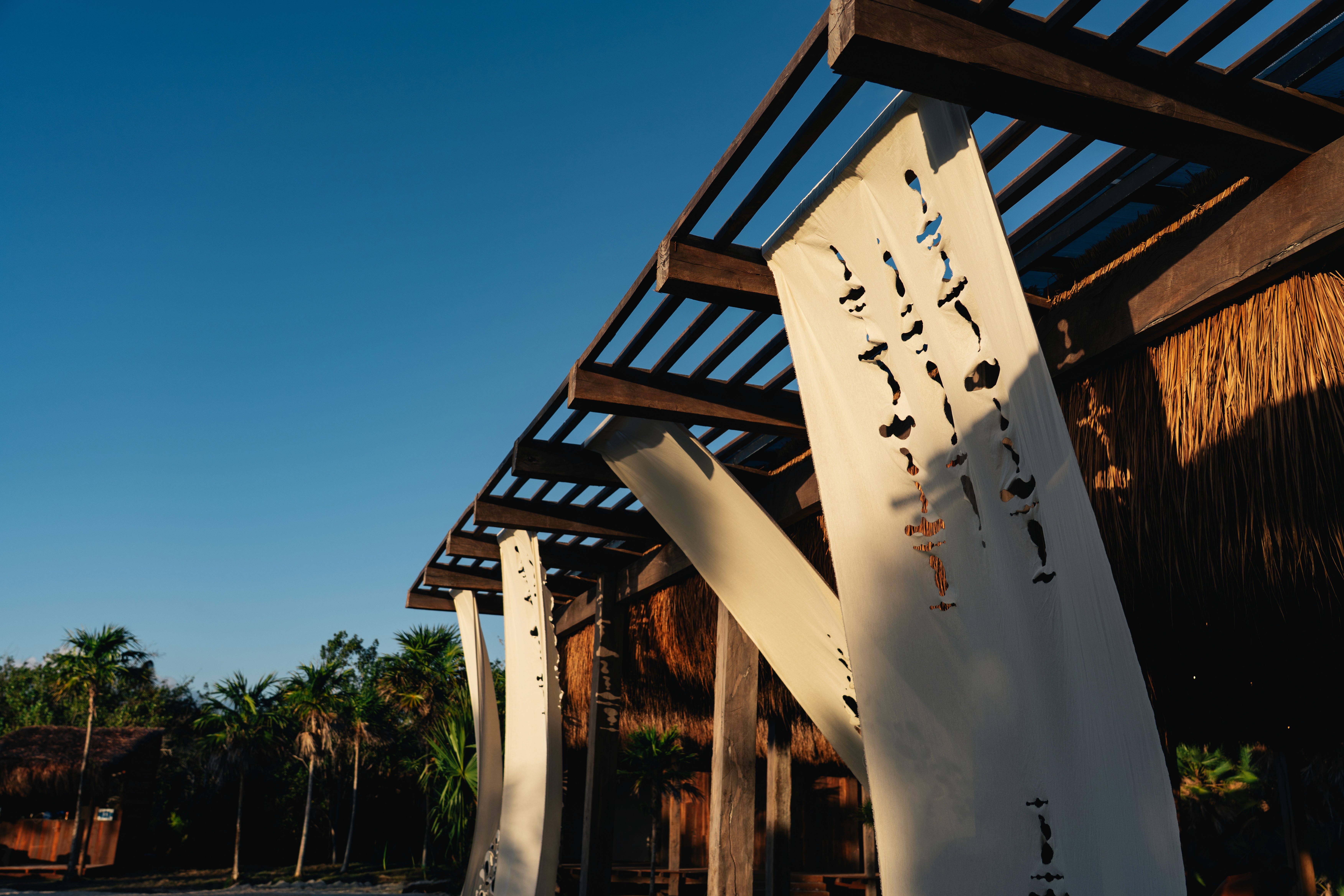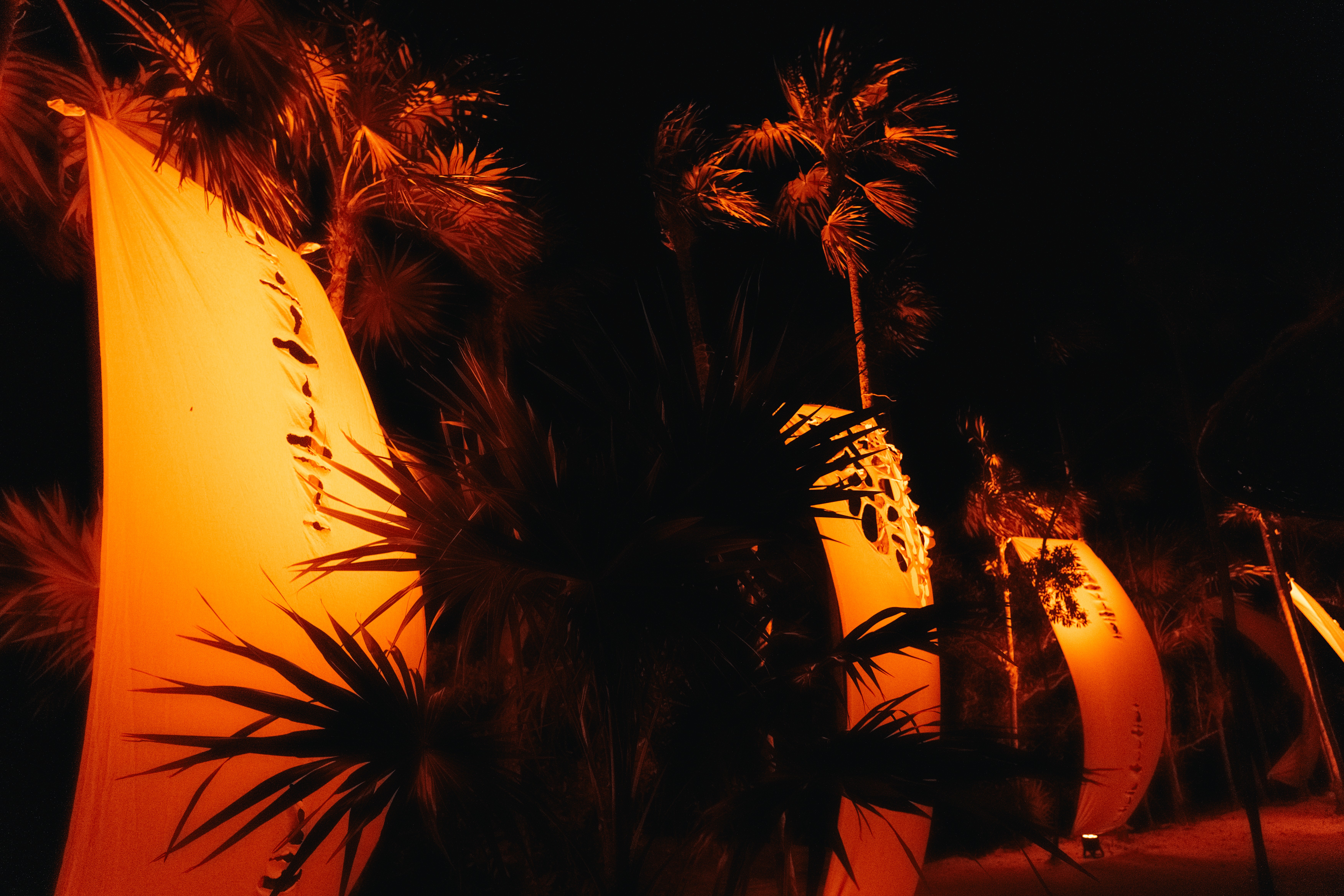 Over 100 meters of natural unbleached canvas were cut into 4-meter drops in two widths (1.20 m and 1.40 m). Patterns were first drawn manually, then rebuilt as vector compositions and laser-cut into the fabric to create precise negative space. The textile panels were rigged across the site — suspended between palm trees and along the palapa perimeter — shaping light, shadow, and airflow throughout the day. Rather than imposing structure onto the landscape, the intervention worked with wind and sunlight, allowing the installation to remain in constant subtle motion. As night fell, the dock became a central visual axis through laser mapping. Its structure was re-drawn in motion using linear laser outlines — tracing edges, planks, rails, and contours. The linework was layered in progressive passes that traveled along the pier and extended toward the water, then synchronized to the music to create controlled timing and rhythmic pulses. The result was a site-specific environment where textile, laser, sound, and landscape converged — an ephemeral architecture built from repetition, precision, and atmosphere.