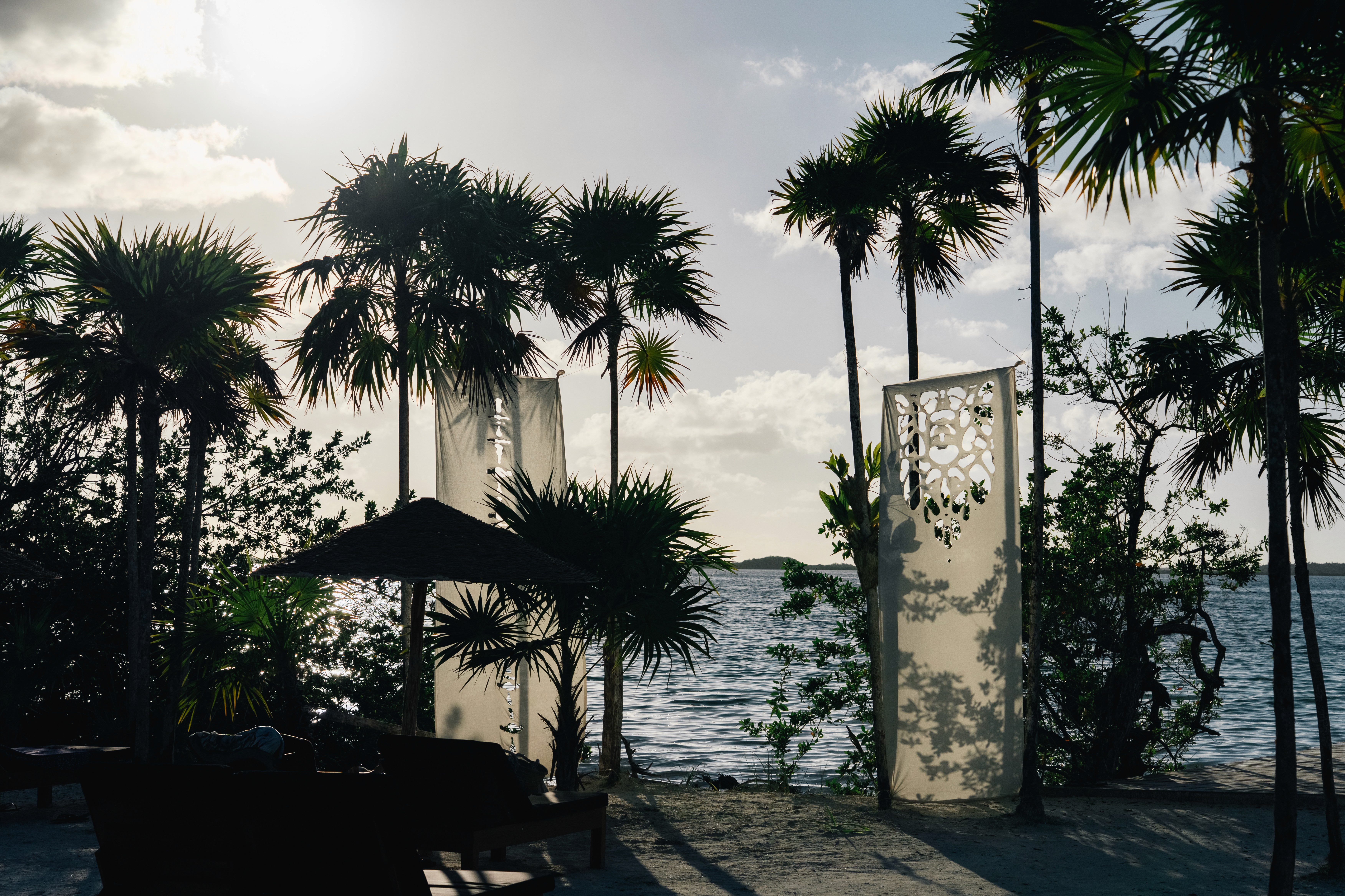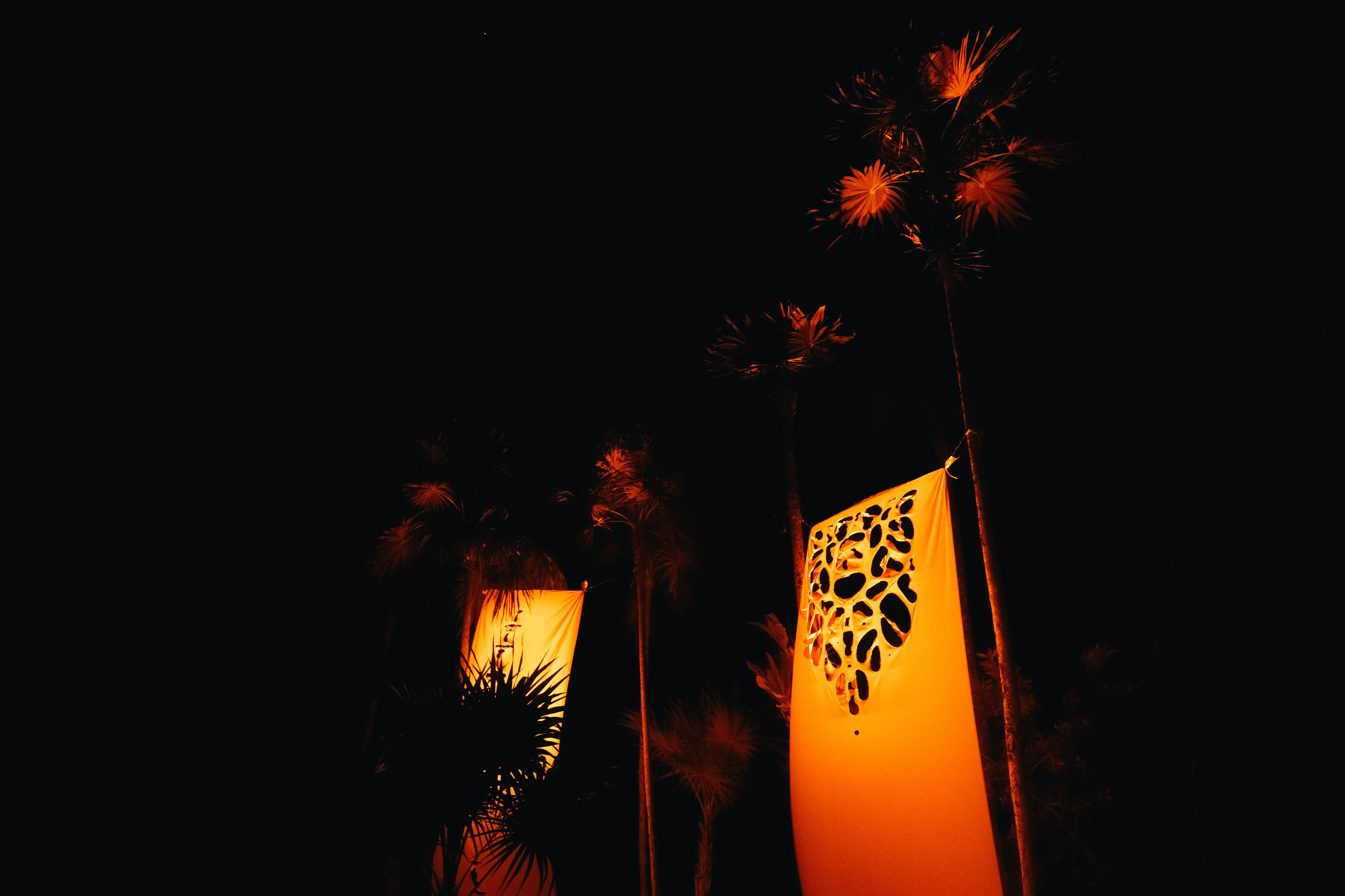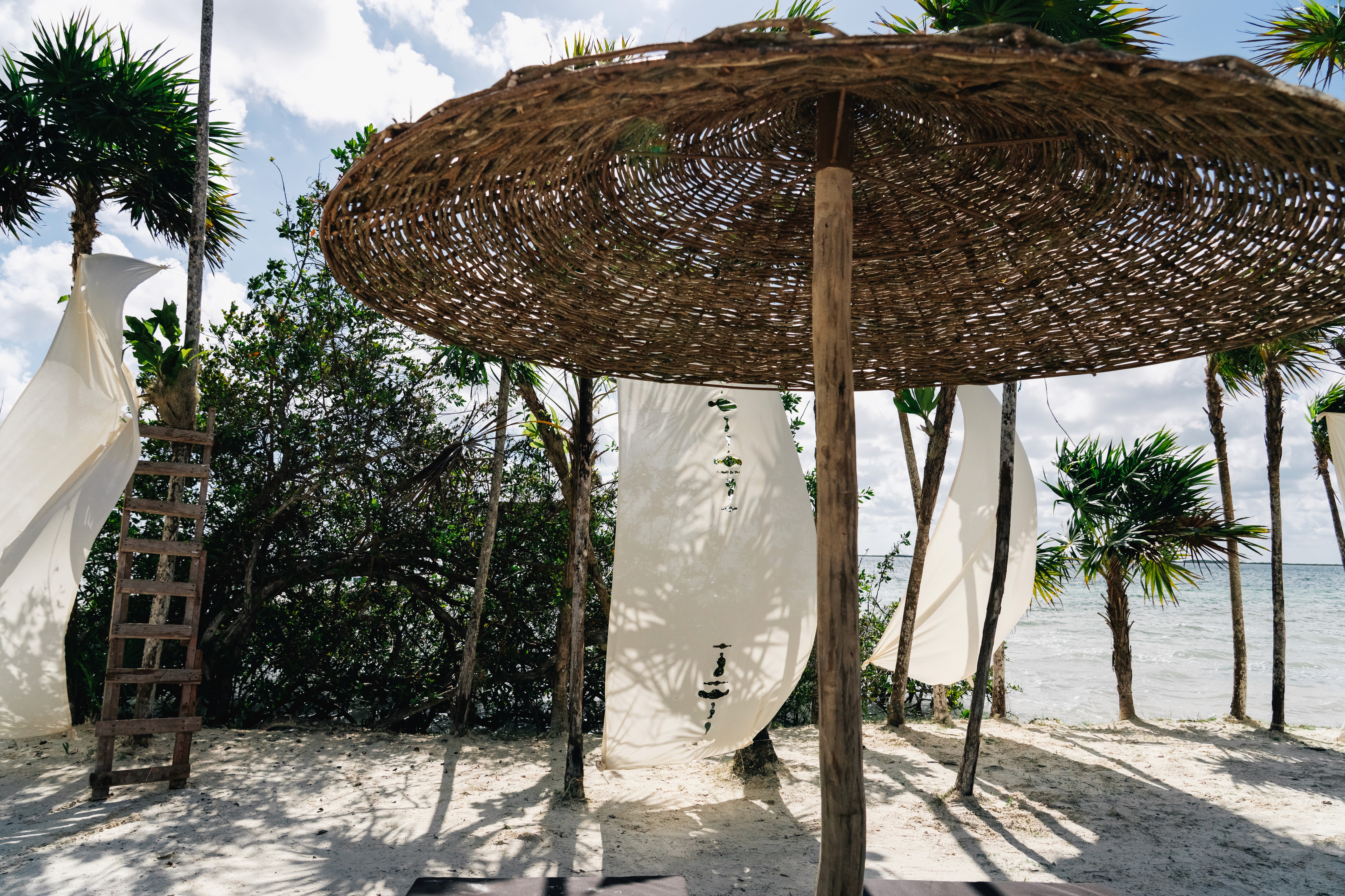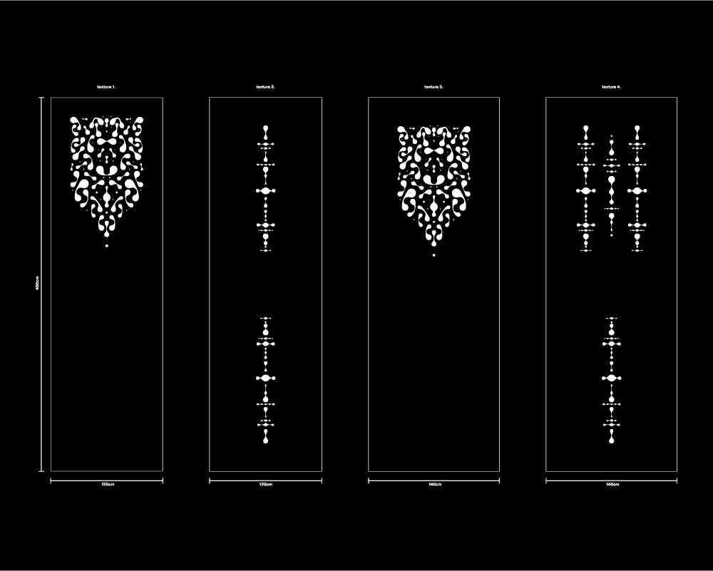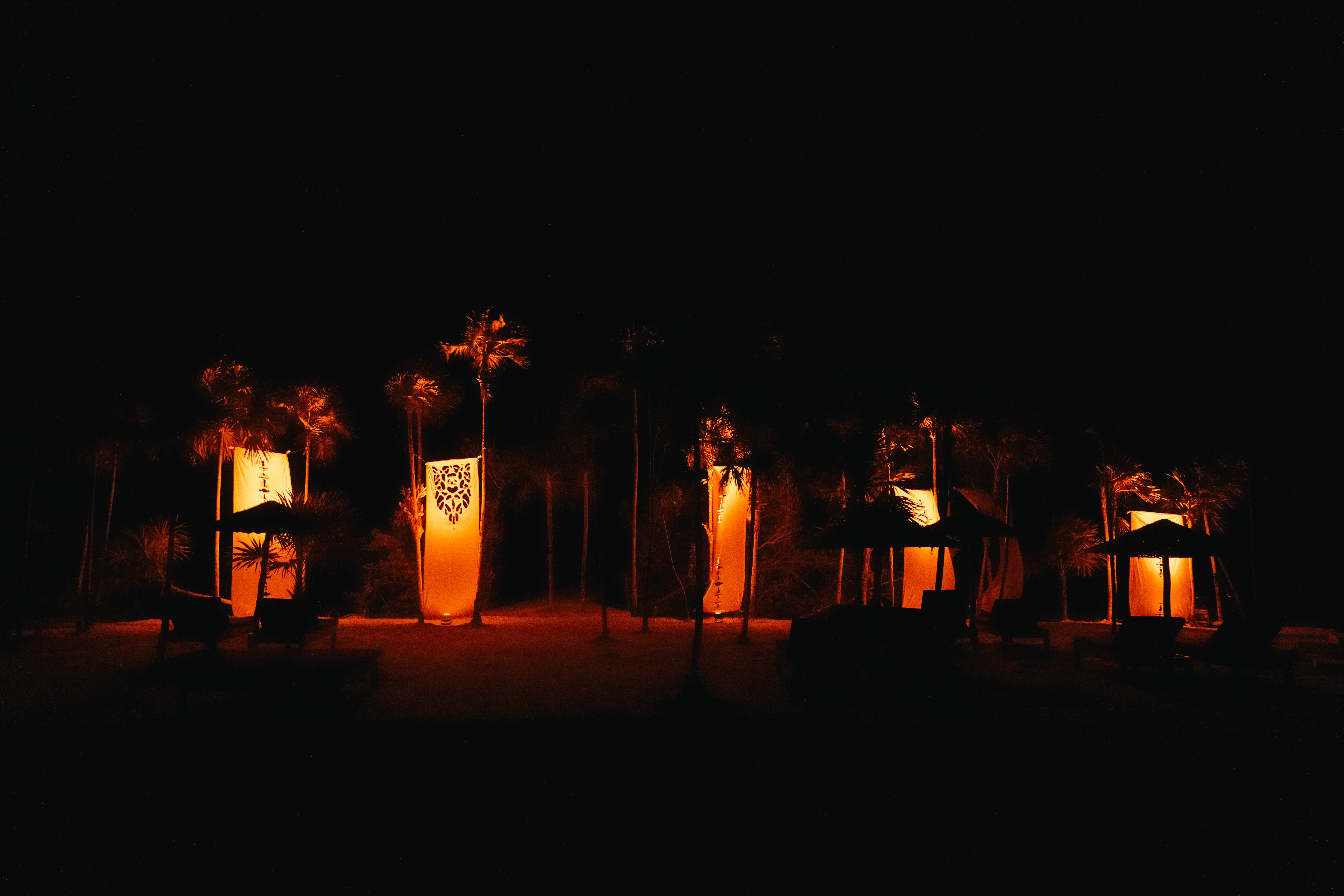 Over 100 meters of natural unbleached canvas were cut into 4-meter drops in two widths (1.20 m and 1.40 m). Patterns were first drawn manually, then rebuilt as vector compositions and laser-cut into the fabric to create precise negative space. The textile panels were rigged across the site — suspended between palm trees and along the palapa perimeter — shaping light, shadow, and airflow throughout the day. Rather than imposing structure onto the landscape, the intervention worked with wind and sunlight, allowing the installation to remain in constant subtle motion. As night fell, the dock became a central visual axis through laser mapping. Its structure was re-drawn in motion using linear laser outlines — tracing edges, planks, rails, and contours. The linework was layered in progressive passes that traveled along the pier and extended toward the water, then synchronized to the music to create controlled timing and rhythmic pulses. The result was a site-specific environment where textile, laser, sound, and landscape converged — an ephemeral architecture built from repetition, precision, and atmosphere.