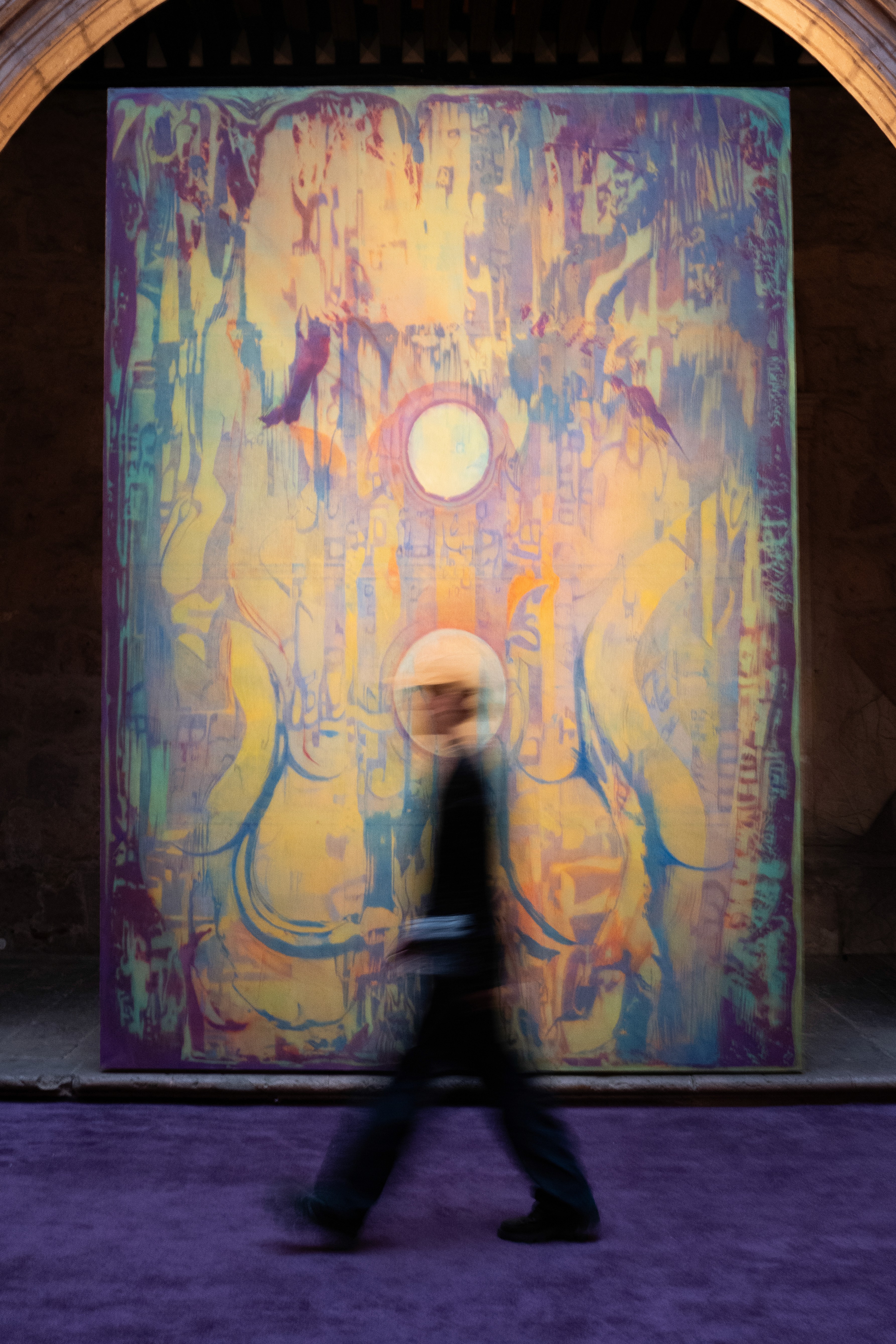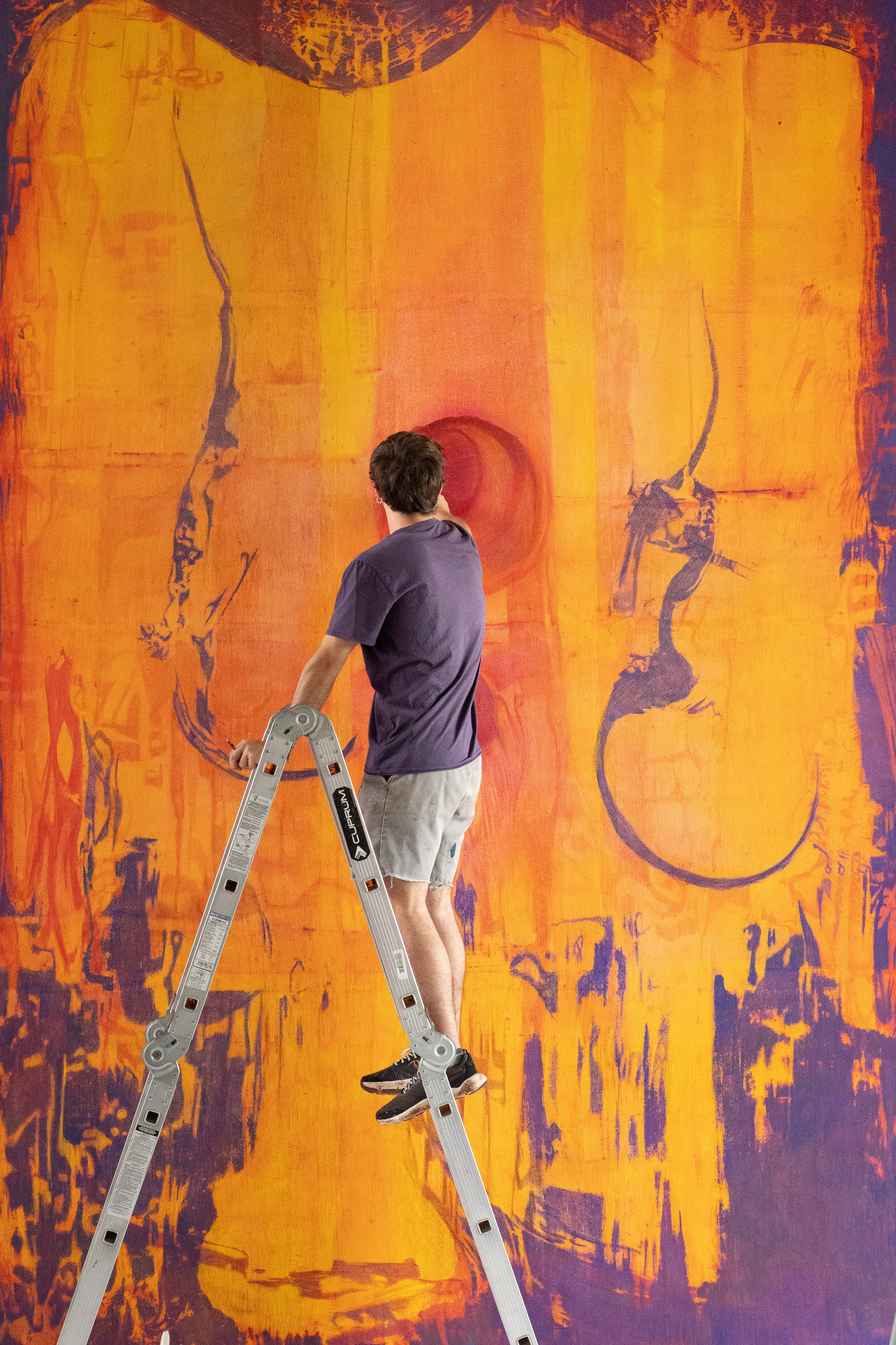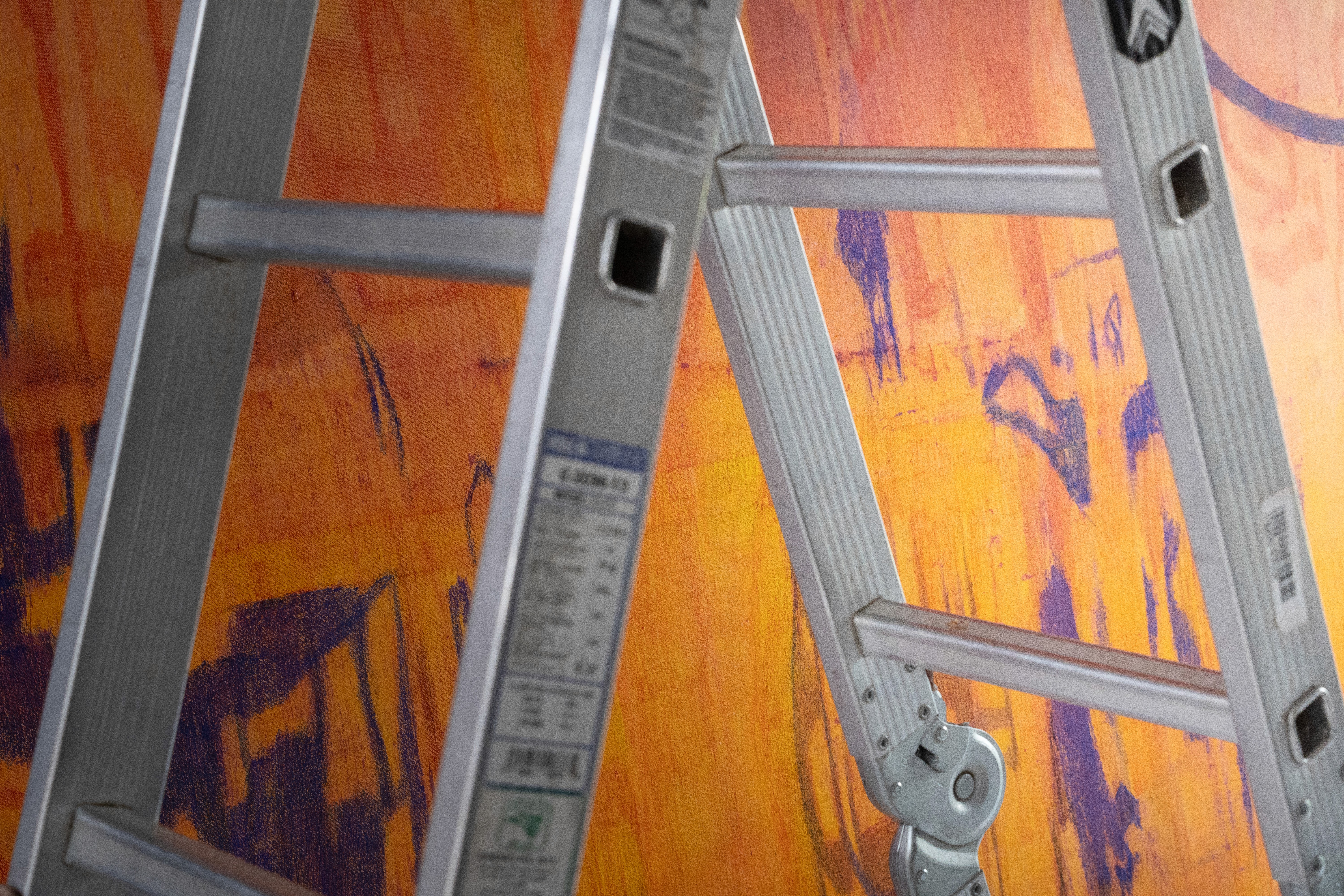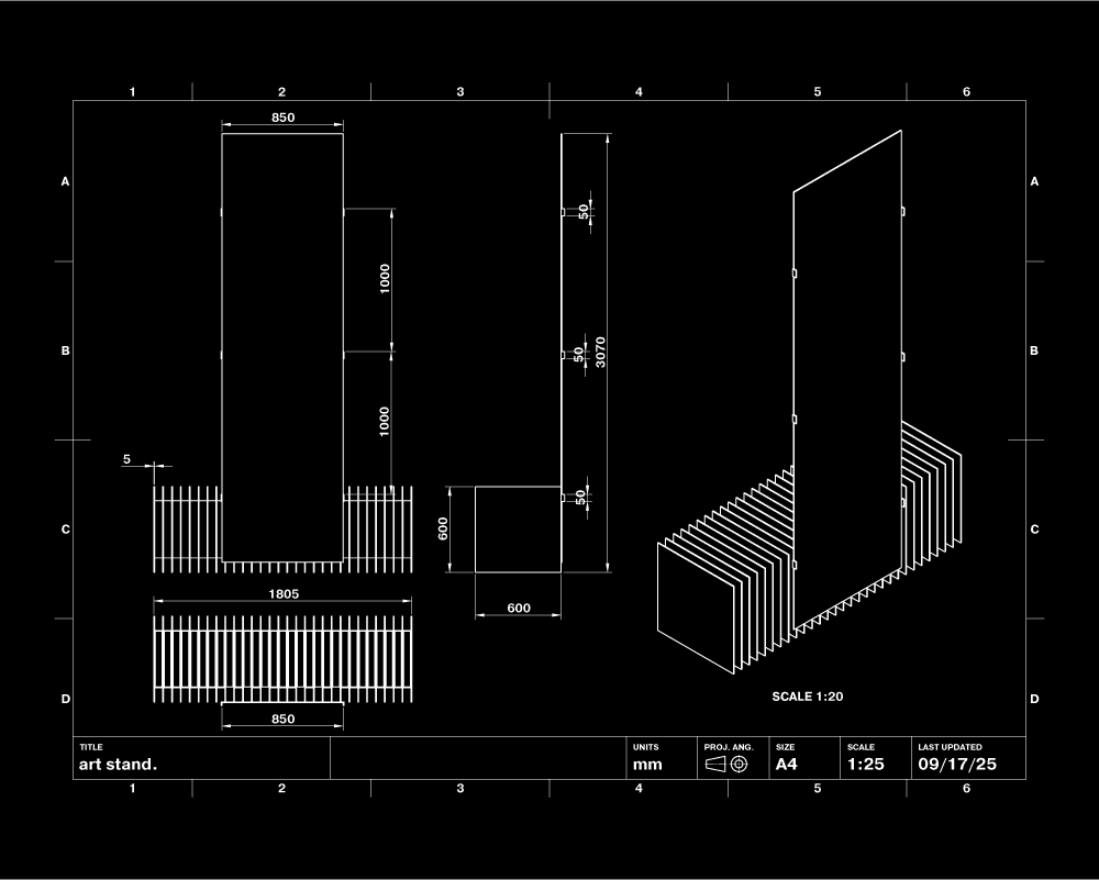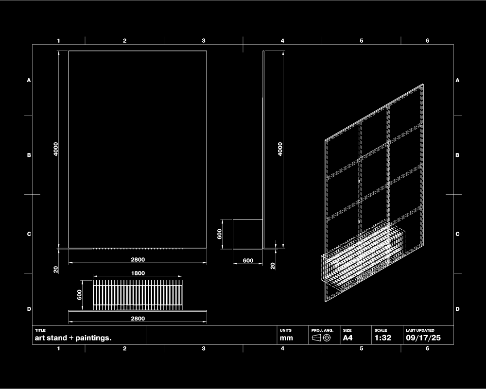 rastro designed and constructed the structural bases supporting the four large-scale paintings. The solution consisted of a continuous metal base built from the linear repetition of 2.54 cm PTR steel profiles, welded into a single low-profile structure. Each 400 × 280 cm piece was anchored from behind to a concealed metal plate and suspended 2 cm above the floor, creating the illusion of levitation — as if the works were floating, held by nothing. The intervention merges industrial precision with perceptual subtlety, allowing the support system to remain visually discreet while reinforcing the monumental presence of the paintings.