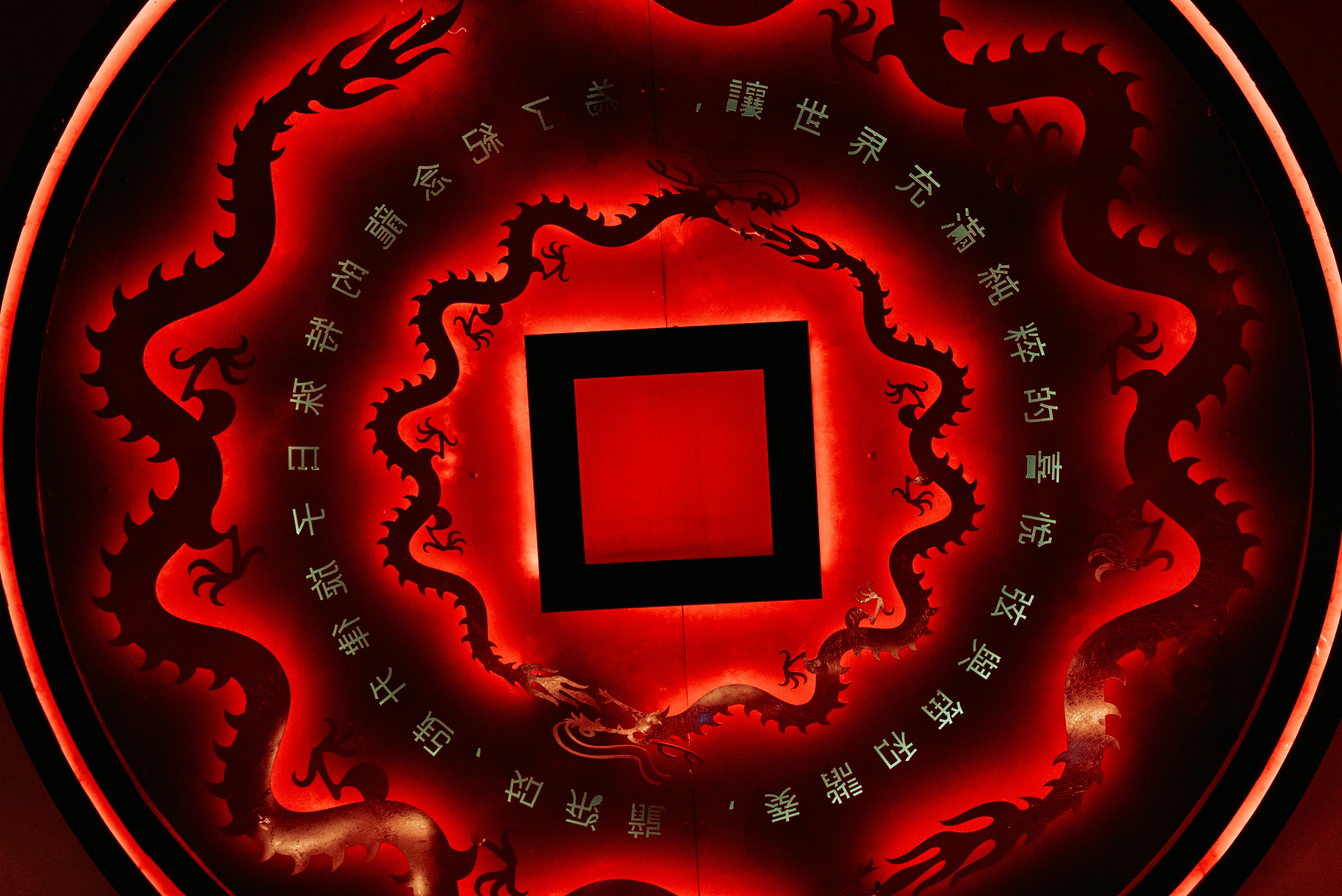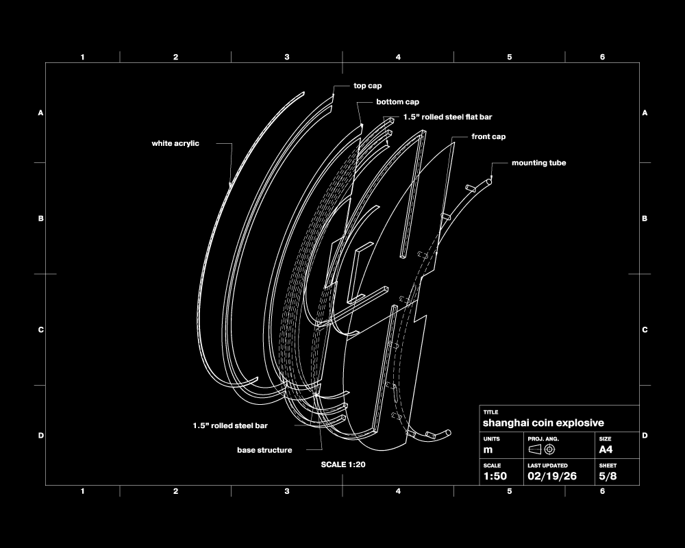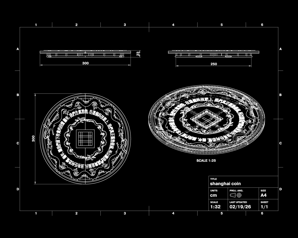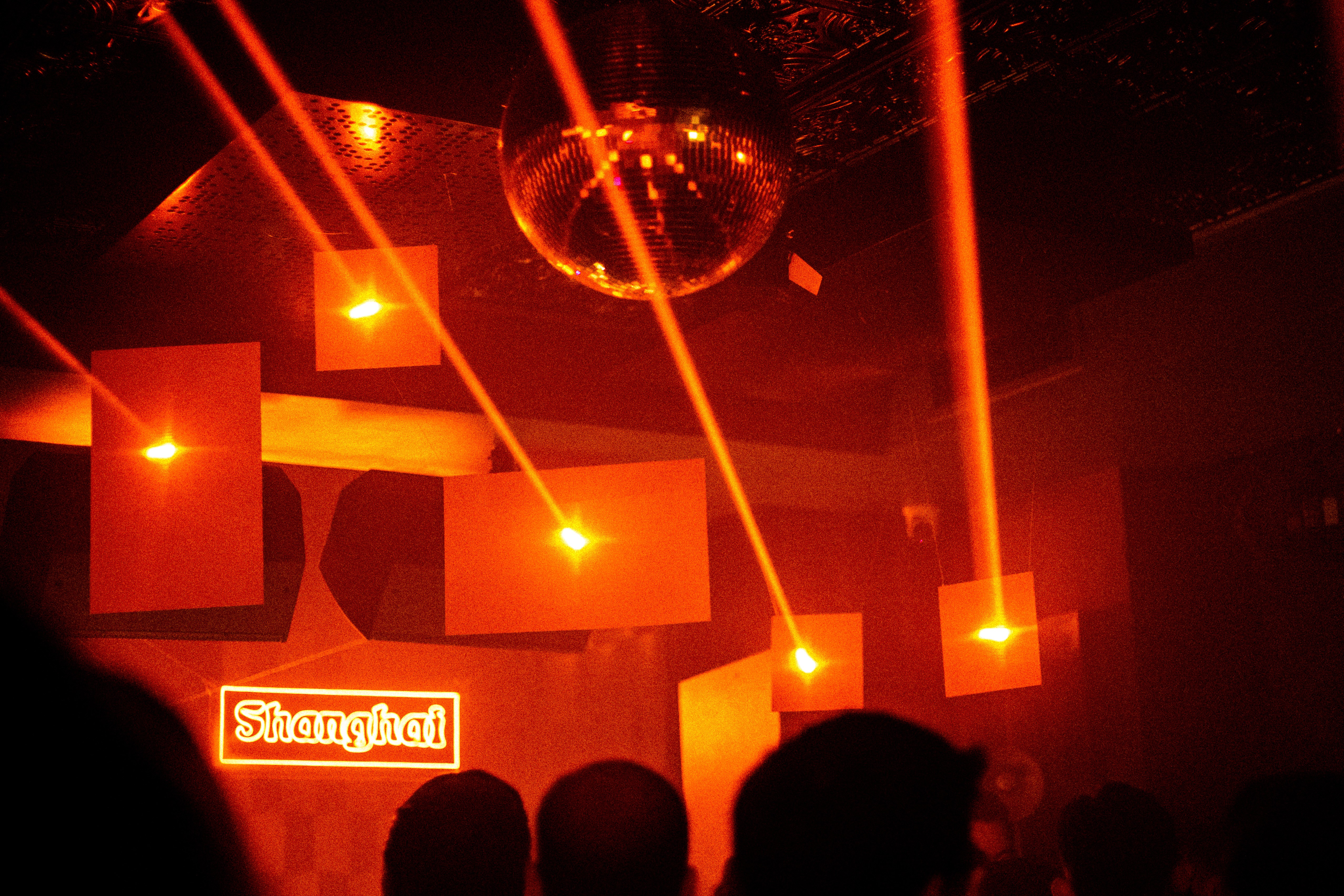 Laser installations activated the volume of the space, cutting through haze and emphasizing architectural depth. At the center of the main room, a giant Chinese coin structure was designed and installed as the DJ booth backdrop — functioning as both symbolic anchor and visual focal point. The piece translated cultural reference into large-scale scenography, reinforcing Shanghai Café’s graphic universe within the physical environment.