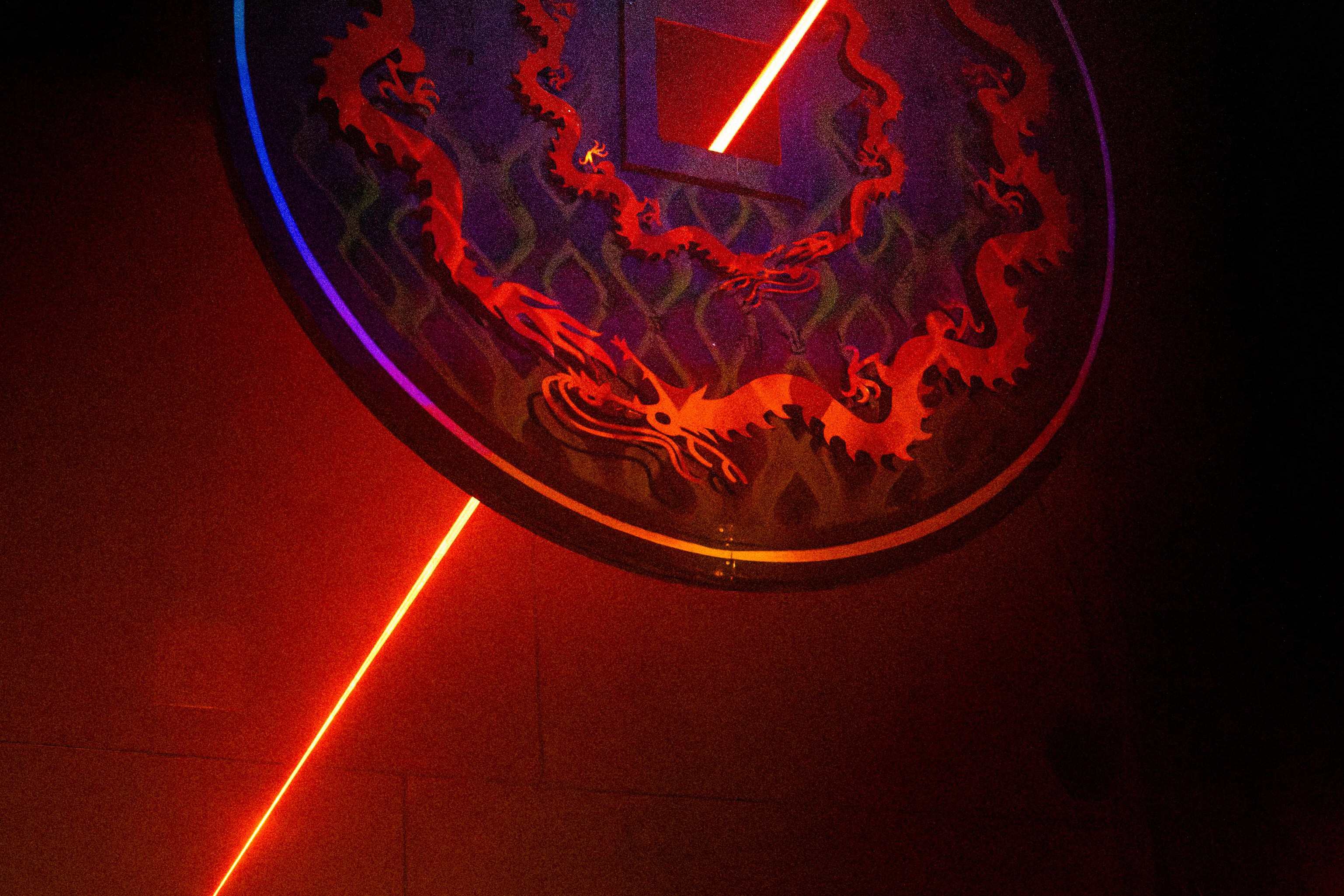 The main room was conceived as the central pulse of the night — a fully immersive dance environment shaped by light, rhythm, and graphic intervention. Custom neon signage inspired by Chinese typography was designed and installed to reinforce the platform’s visual identity, embedding cultural references directly into the spatial language. A laser system was integrated to redraw the architecture in motion, cutting through haze and amplifying the kinetic energy of the dance floor.