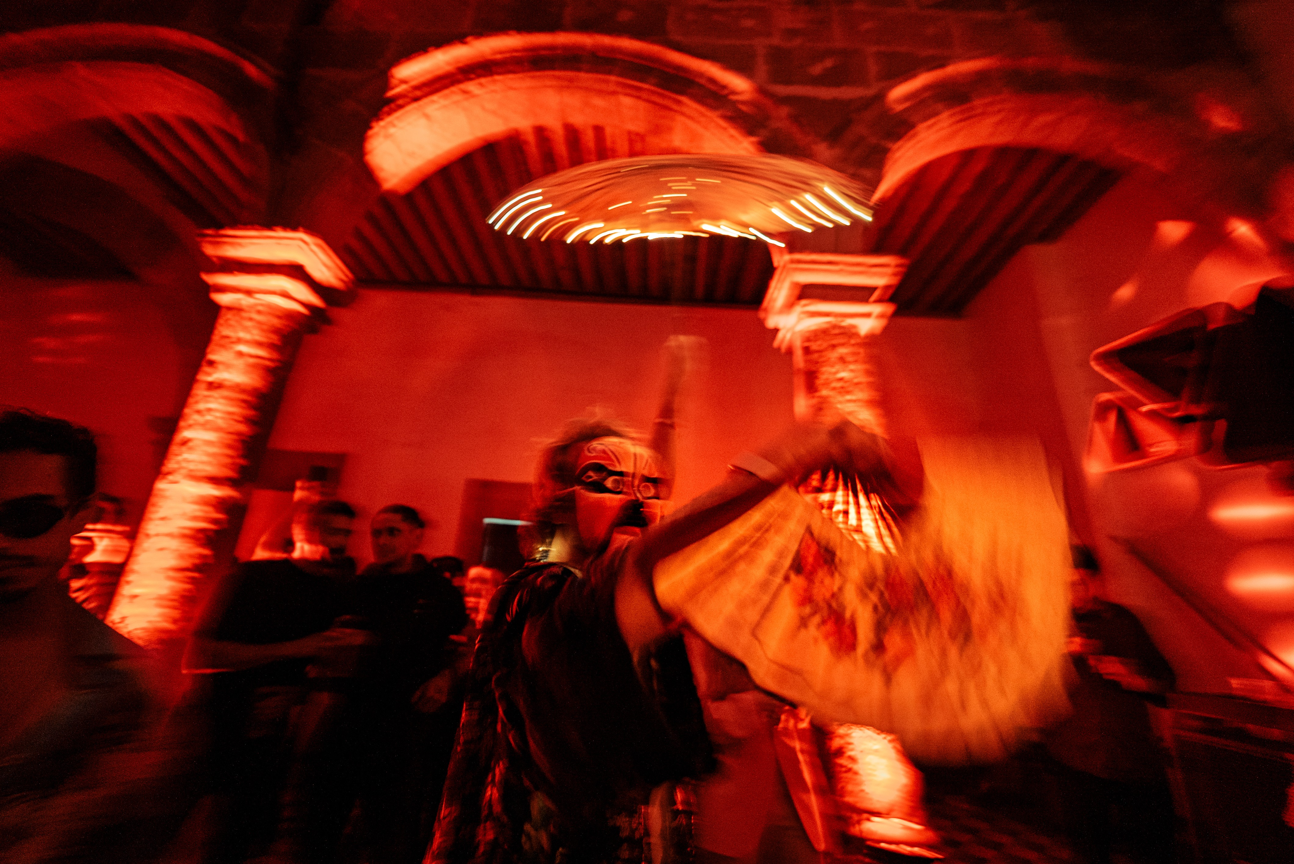 Laser systems traced architectural lines across walls and corridors, activating arches, patios, and textures with precise beams and volumetric haze. Lighting design shifted the house from a historical residence into an immersive night environment.